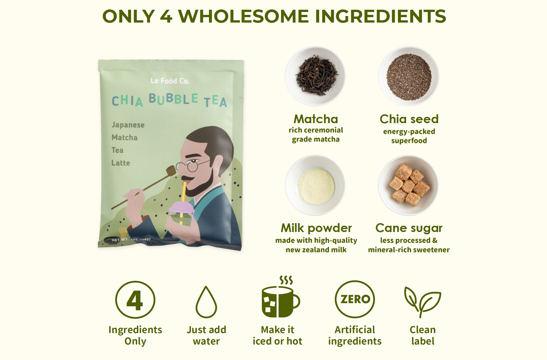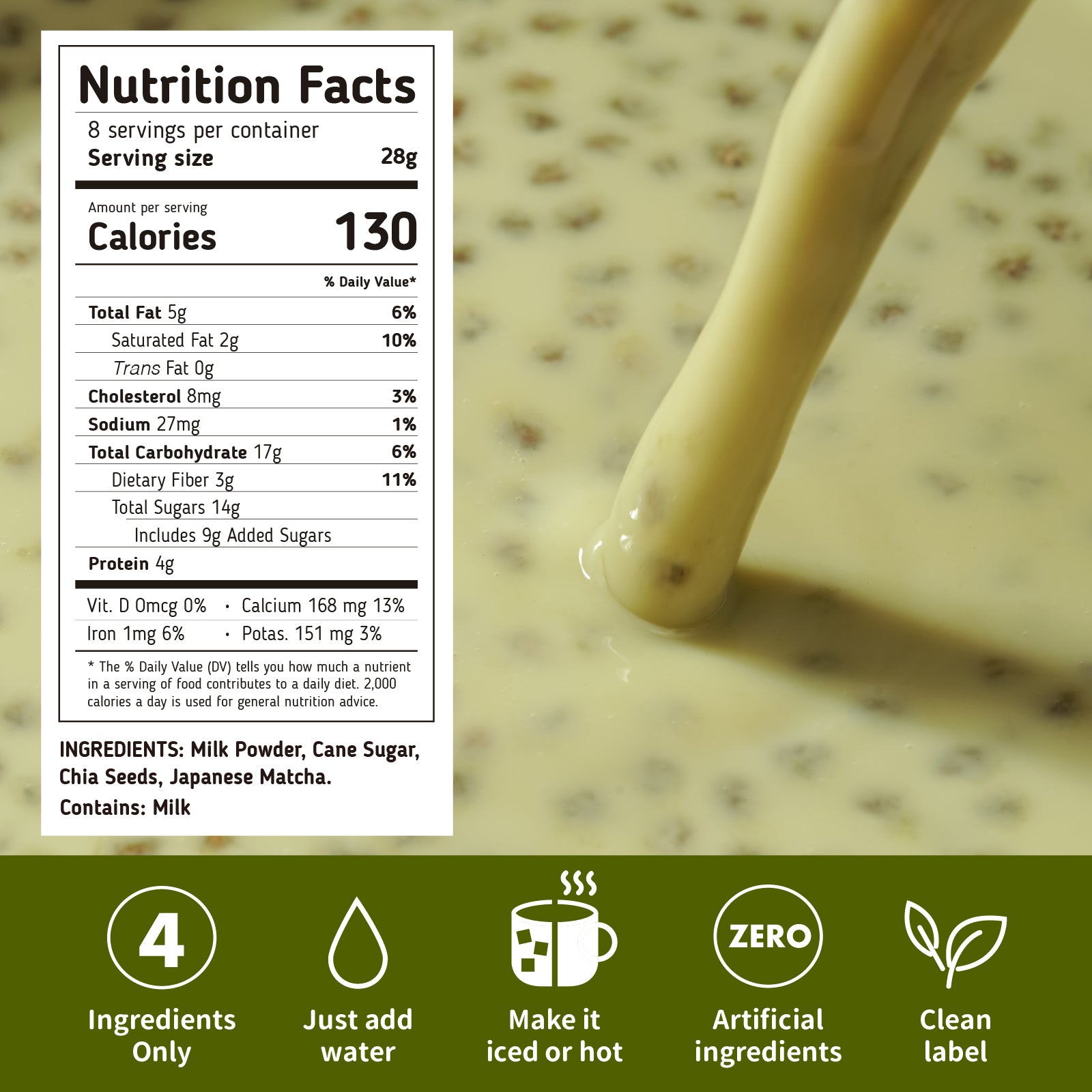 milk powder, cane sugar, chia seeds, Japanese matcha
