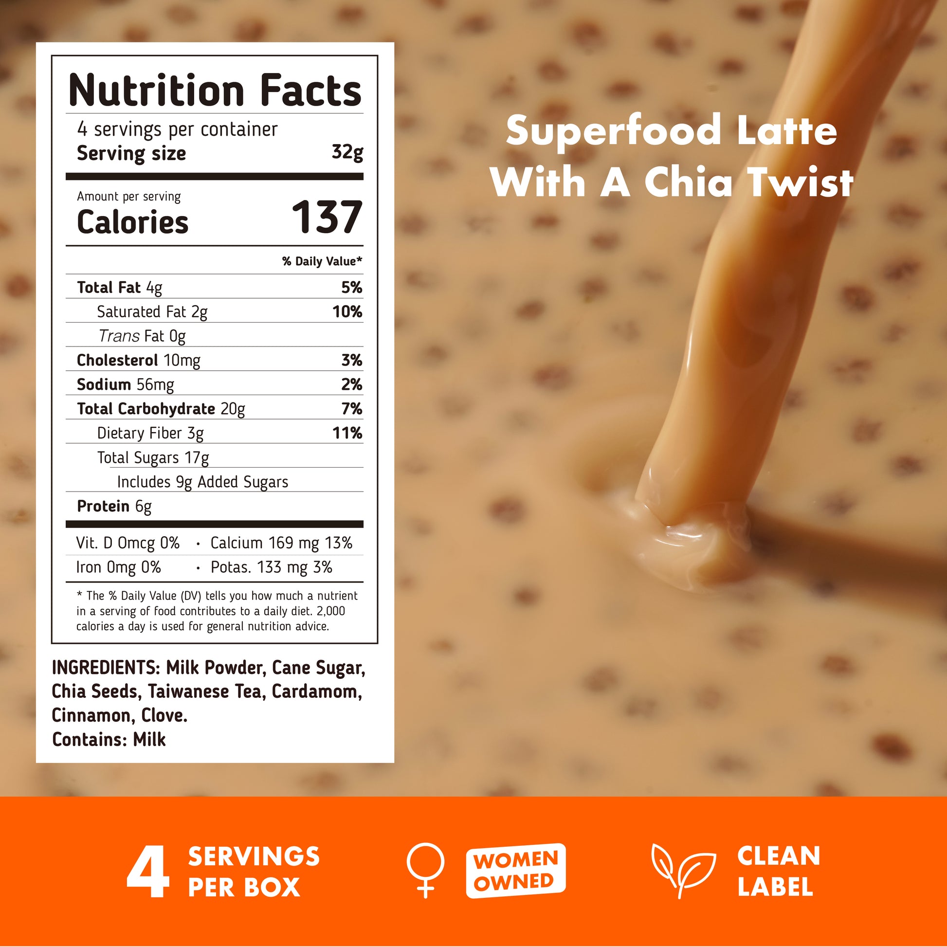 milk powder, cane sugar, chia seeds, taiwanese tea.